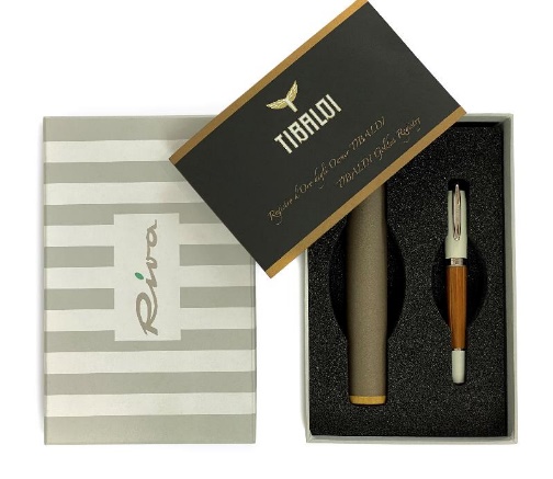 The pens’ barrels are made of hand-inlaid wood with a pattern recalling Riva boat decks. All the Tibaldi for Riva pens come in an elegant metal container lacquered in a colour matching that of the pen and closed by a wooden cap.