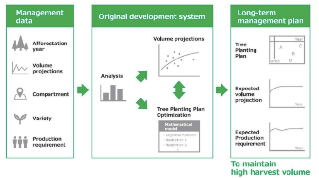 Utilizing this model in conjunction with yield projections derived from rubber tree farm data, including time series yield data and spatial farm data, the system uses a mixed-integer programming approach to derive an optimal solution on which clones of trees should be planted when, where, and in what quantity in order to maintain high natural rubber productivity. Going forward, Bridgestone will further customize the system before offering it for use at other farms with the aim of contributing to a sustainable and stable global supply of natural rubber.
