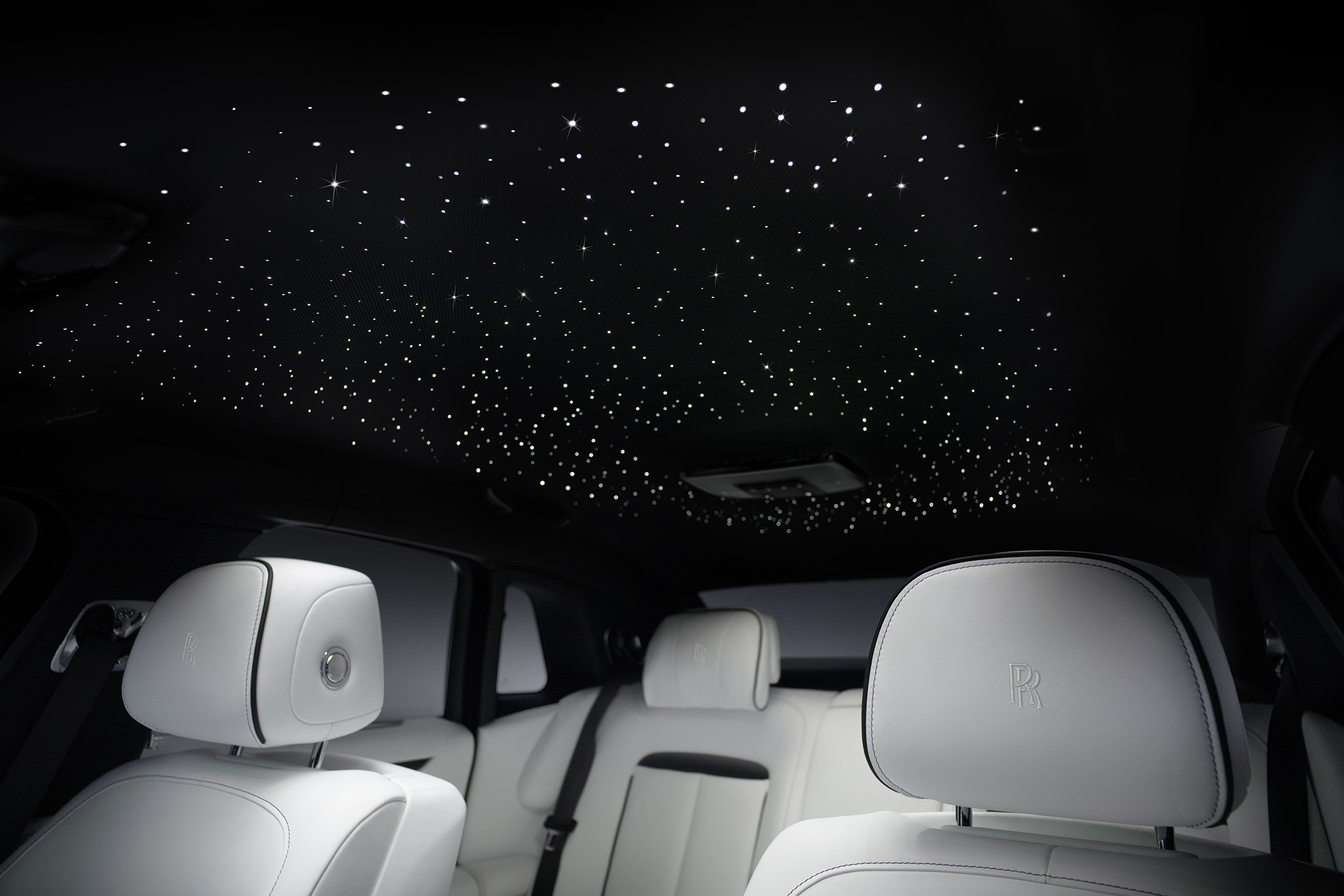 Developed over the course of two years and more than 10,000 collective hours, the ethereal glowing Ghost nameplate is surrounded by more than 850 stars, into the interior suite of the motor car. Located on the passenger side of the dashboard, the constellation and wordmark are completely invisible when the interior lights are not in operation. To ensure the Ghost wordmark is lit evenly, a 2mm-thick light guide is used, featuring more than 90,000 laser-etched dots across the surface.
