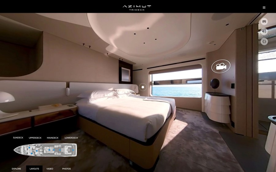 The launch of the new flagship also gave Azimut Yachts the chance to bring forward the introduction of A-LIVE, a cutting-edge multi-sensory immersive digital experience that makes use of 360-degree vision to allow online users to move around the yacht and, above all, to convey the sense of openness and contact with the water.