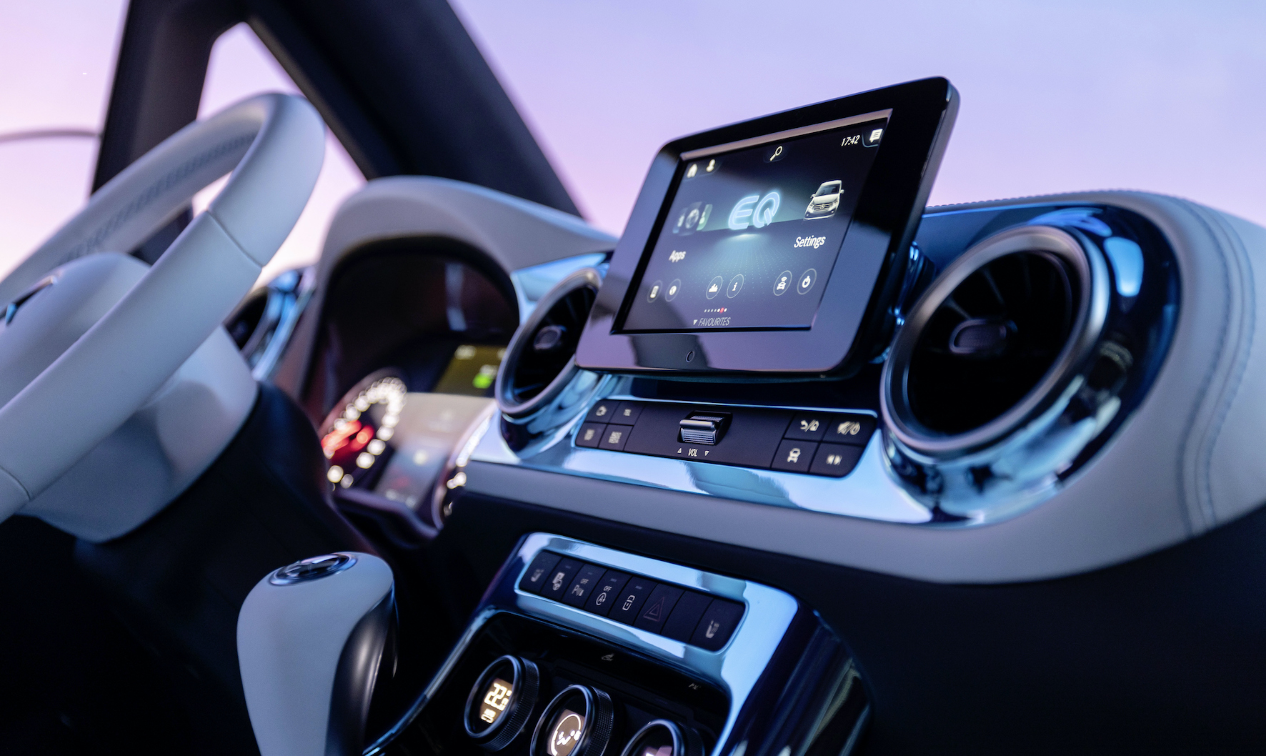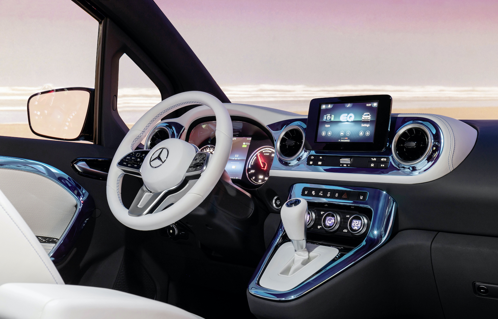 The interior of the Concept EQT is as much an emotional and stylish statement as its exterior – characterised by an elegant contrast of black and white. The seats are upholstered in white nappa leather; the plaited leather applications on the seat centre panel comprise recycled leather. The instrument panel in a sensual design is particularly eye-catching. The upper section is shaped like a wing profile with the appearance of a seashore pebble and fuses dynamically with the instrument cluster. A practical semi-closed stowage compartment is located above the instrument cluster for easy access to important utensils or documents. In addition, round air vents in high-gloss black, galvanised trim elements and the multifunction steering wheel with Touch Control buttons underline the high quality, modern appearance. The ambient lighting on the centre console, doors and in the foot well creates a stylish atmosphere.