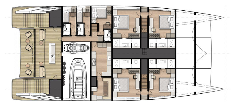 The concept unlocks a new potential for onboard comfort thanks to a design using the volume of both the hulls and bridge deck to achieve immense living space. Thanks to this, guest accommodation profits from new, generous amounts of fully-customizable living space. Standout features also include an imposing beach club.