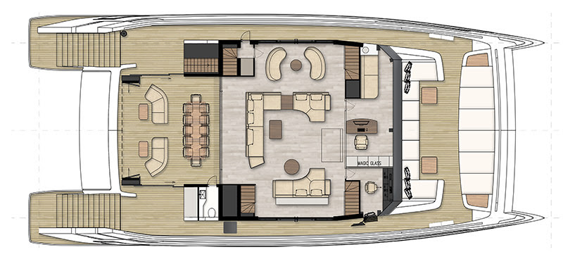With an innovative main deck design, the saloon of the yacht boasts full-height glazing and opens wide onto the sides and the lounging area of the aft cockpit. All spaces offer full freedom in terms of customization. The stern lounge uses the entire beam but can also be enclosed with sliding doors for more privacy in the marinas.