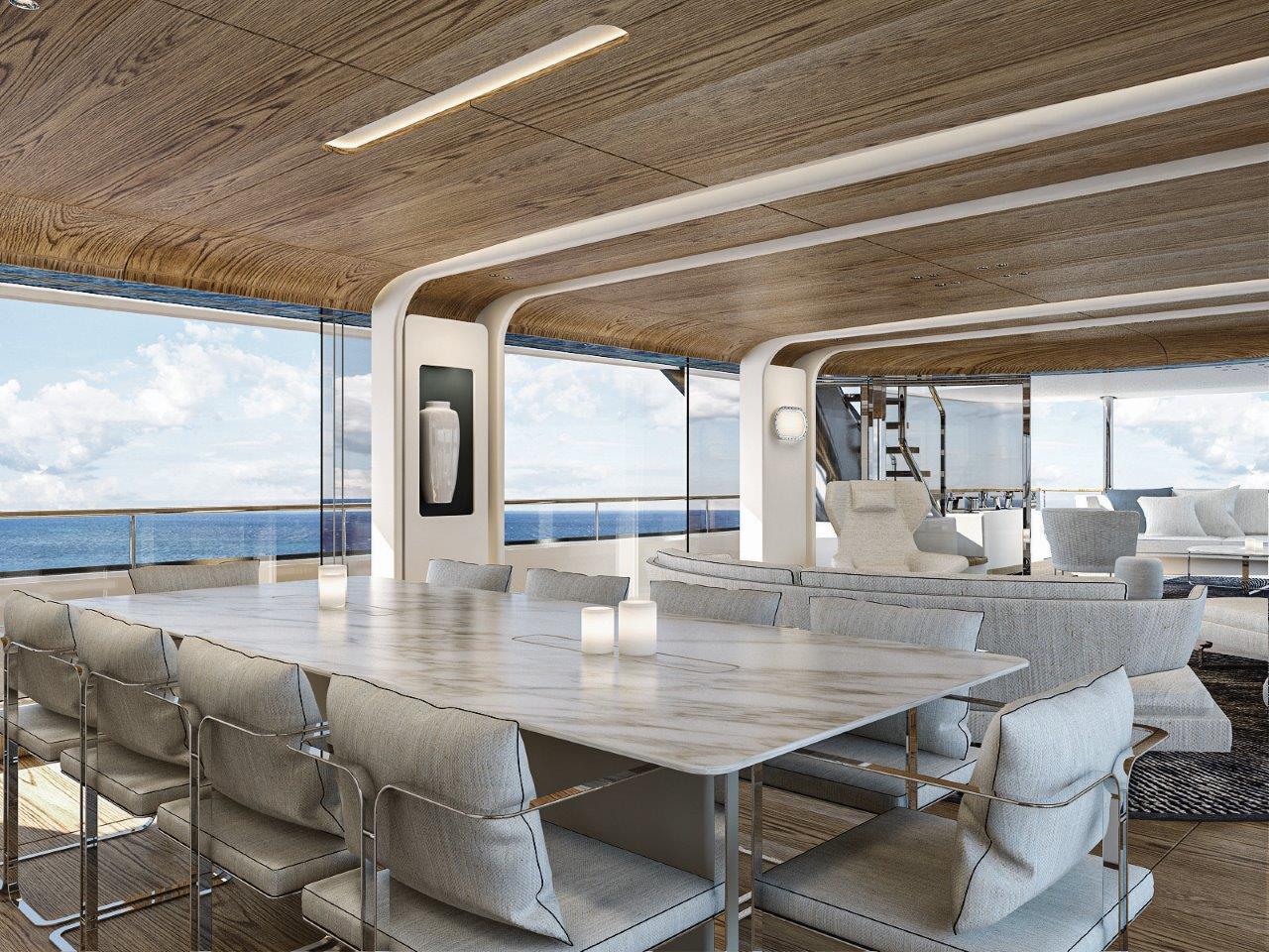Throughout the interiors, a sophisticated palette based on shades of light wood, white and blue, immediately brings the mind back to the tradition of seafaring, reinterpreted in a timeless key. An innovative, seamless, bronze metallic painted ribbon defines the bulwark running from the main deck to the upper deck overhang, a nod to the historic wooden cap rail.