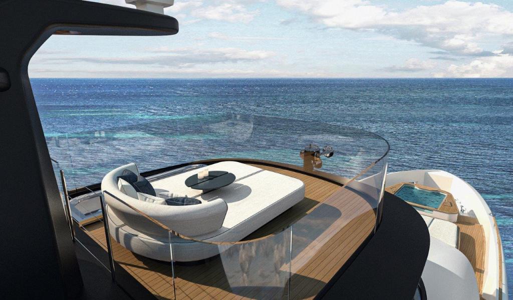 The definitive elements of the yacht include the Observation Deck which, positioned above the hard top, provides a small sheltered living area, absolutely intimate with a unique view at any time of day, and the transom, a nod to the iconic models of the Sixties with a modern twist in the form of a beach club, designed to respond to the expectations of today’s boat owners.