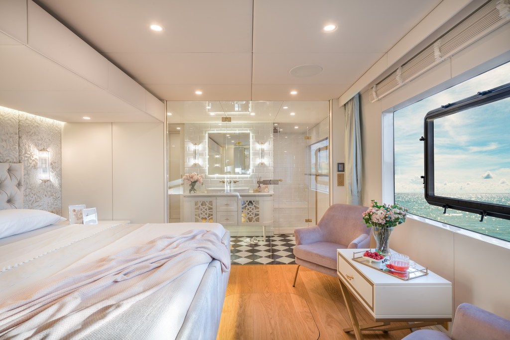 The master suite features a king-size bed and a relaxation area with an ocean view. One of the suite’s stand-out features is the generous master bathroom with classic black and white tiling.