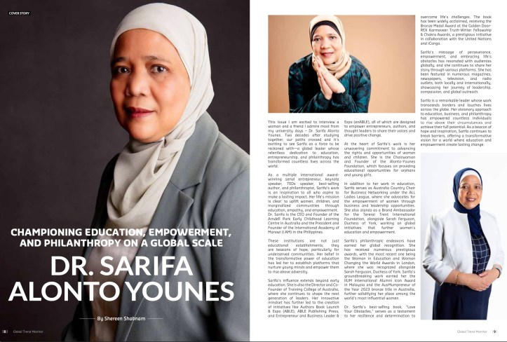 This issue I am excited to interview a woman and a friend I admire most from my university days – Dr. Sarifa Alonto Younes. Two decades after studying together, our paths crossed and its exciting to see Sarifa as a force to be reckoned with—a global leader whose relentless dedication to education, entrepreneurship, and philanthropy has transformed countless lives across the world.