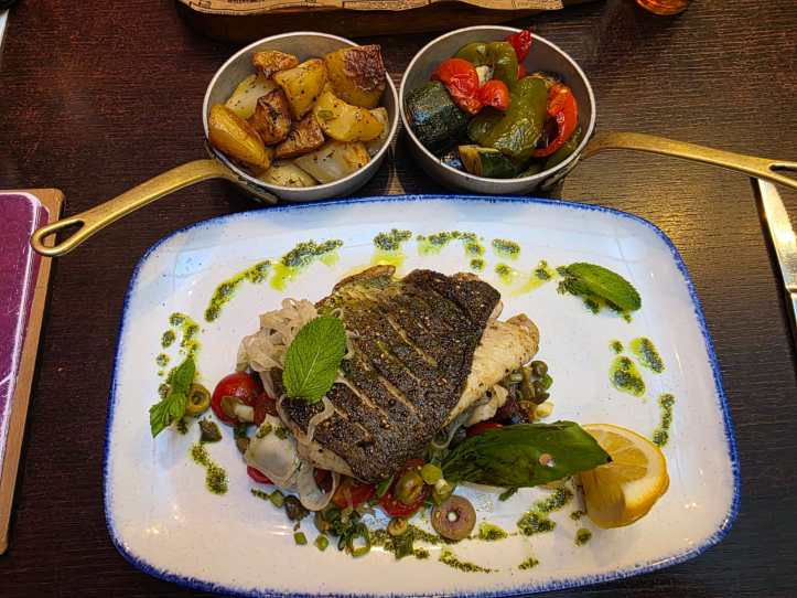For my main course, I chose the Pan-Fried Brown Meager (Gurbell), a fish dish full of character and balance. Cooked to perfection and accompanied by tomatoes, fresh herbs, olives, capers, pickled fennel, and roasted potatoes, it was a plate that celebrated both freshness and tradition.